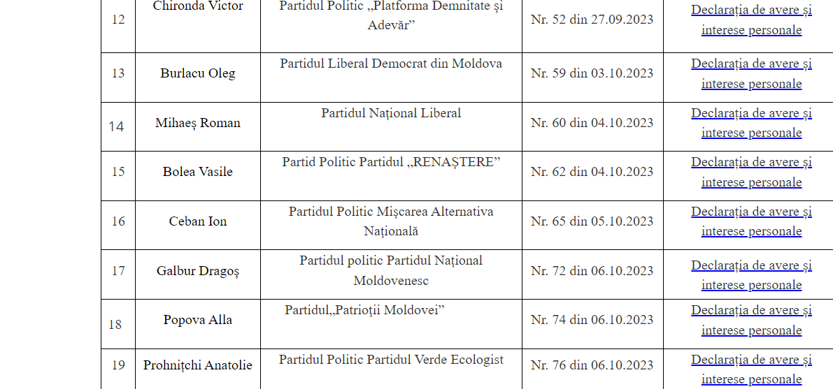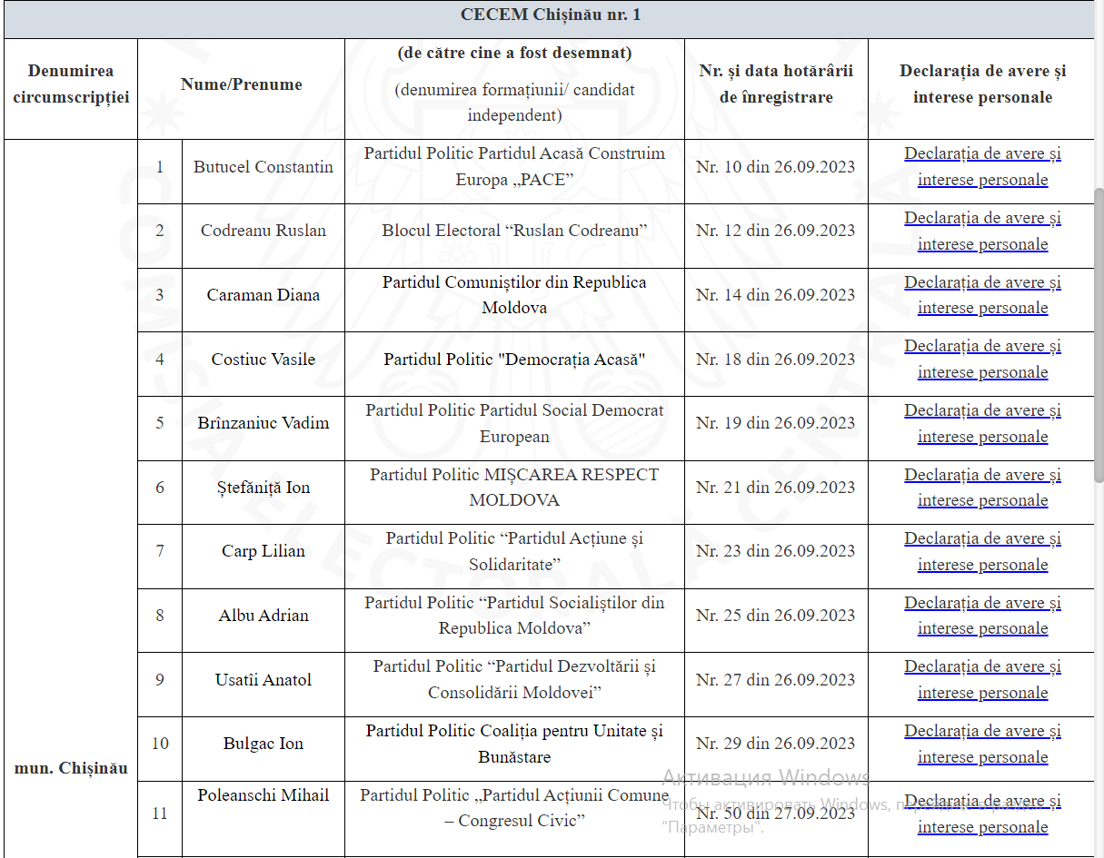 Lista candidaților înregistrați pentru funcția de primar la alegerile locale generale din 5 noiembrie 2023 în circumscripția electorală municipală Chișinău, nr. 1: