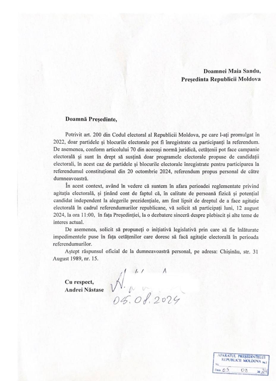 Într-un final, fostul președinte al Platformei DA a depus a depus demersul oficial prin care o invită pe Maia Sandu la dezbateri lunea viitoare, pe 12 august, rugând-o pe șefa statului să îi răspundă „personal, în scris”.