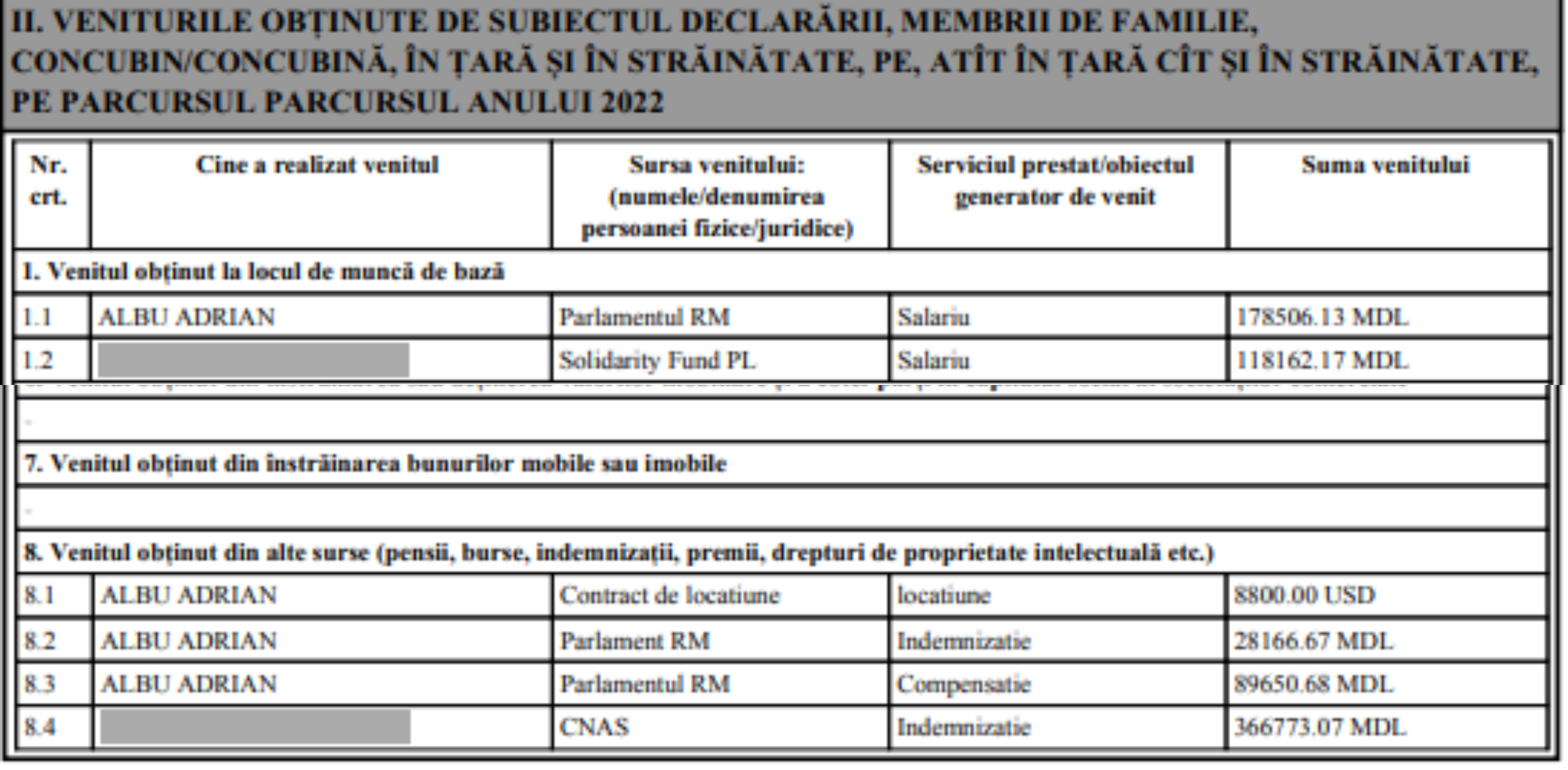 De asemenea, printre veniturile declarate în 2022, candidatul PSRM la funcția de primar al Capitalei include un contract de locațiun pentru care a primit 8.800 de dolari (circa 157.841 de lei - n. red.), o indemnizație de la Parlament în valoare de 28.166 de lei și o compensație, de la aceeași instituție, de 89.650 de lei.
