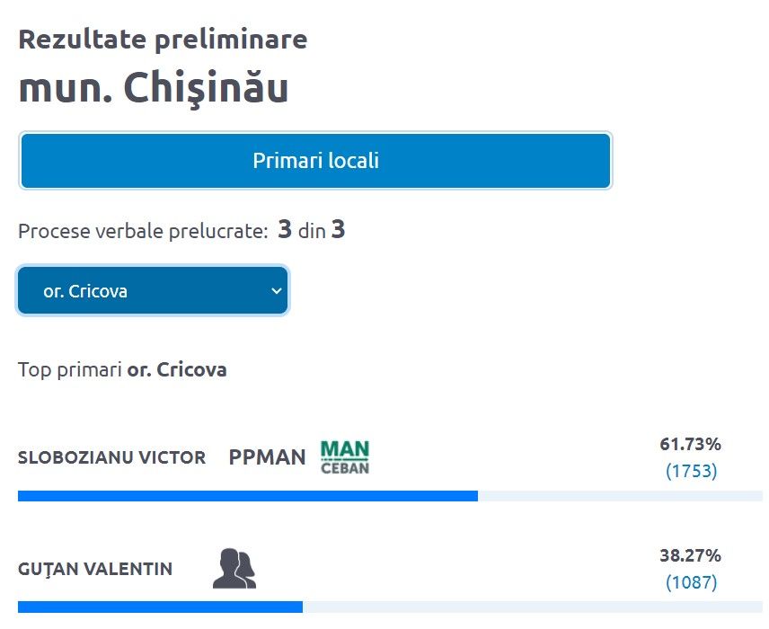 Conform rezultatelor de pe pagina Comisiei Electorale Centrale (CEC), Valentin Guțan a pierdut al 10-lea mandat de primar, fotoliul fiind câștigat de candidatul din partea Partidului Mișcarea Alternativa Națională (MAN), Slobozianu Victor.