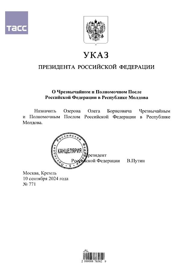 Președintele rus Vladimir Putin a semnat un decret prin care l-a retras pe Oleg Vasnețov din funcția de ambasador al Rusiei în R. Moldova și un altul, prin care l-a numit în locul lui pe Oleg Ozerov. Decretele au fost semnate pe 10 septembrie și publicate pe portalul actelor oficiale.
