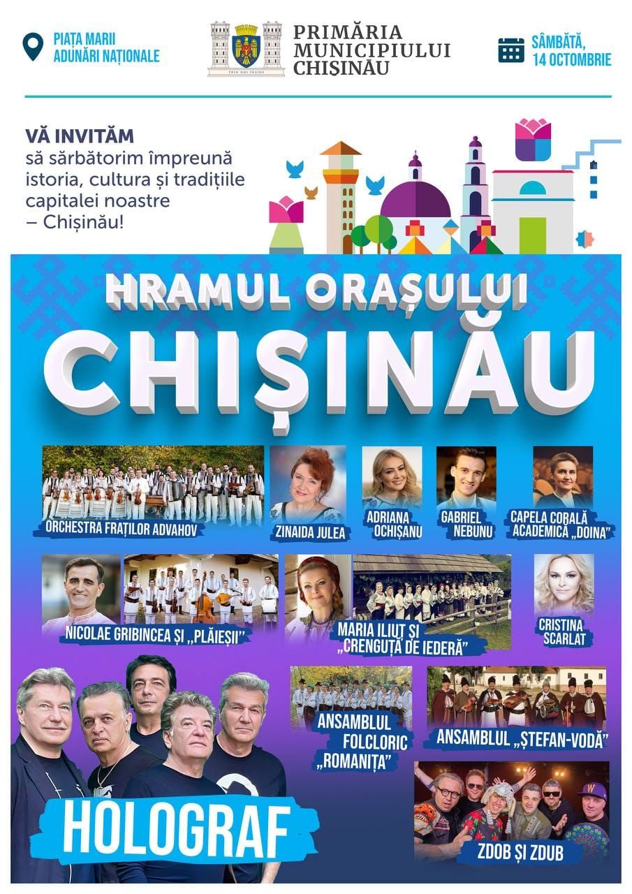 Pe data de 14 octombrie, capitala sărbătorește Hramul orașului. Programul evenimentului include concerte, expoziții, târguri și alte activități. Invitatul special care va evolua pe scena din Piața Marii Adunări Naționale (PMAN) va fi formația Holograf. De asemenea, pe scenă vor urca formația Zdob și Zdub, Frații Advahov, Plăieșii și alții.