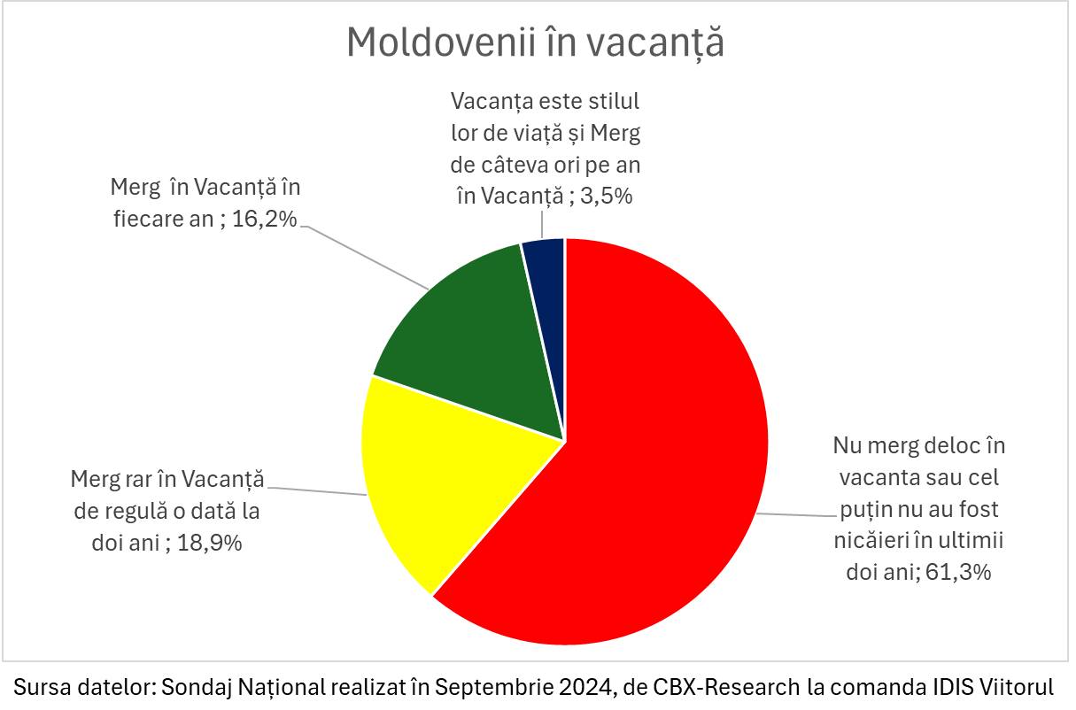 Mai bine de jumătate dintre moldoveni nu merg în vacanță sau cel puțin nu au fost nicăieri în ultimii doi ani, după cum arată datele unui unui sondaj CBS Research, realizat la comanda Institutului pentru Dezvoltare și Inițiative Sociale (IDIS) „Viitorul”. Același sondaj mai arată că 3,5% dintre moldoveni merg de câteva ori pe an în vacanțe, atât în țară, cât și peste hotare. Este vorba de tineri, de la orașe, cu studii.