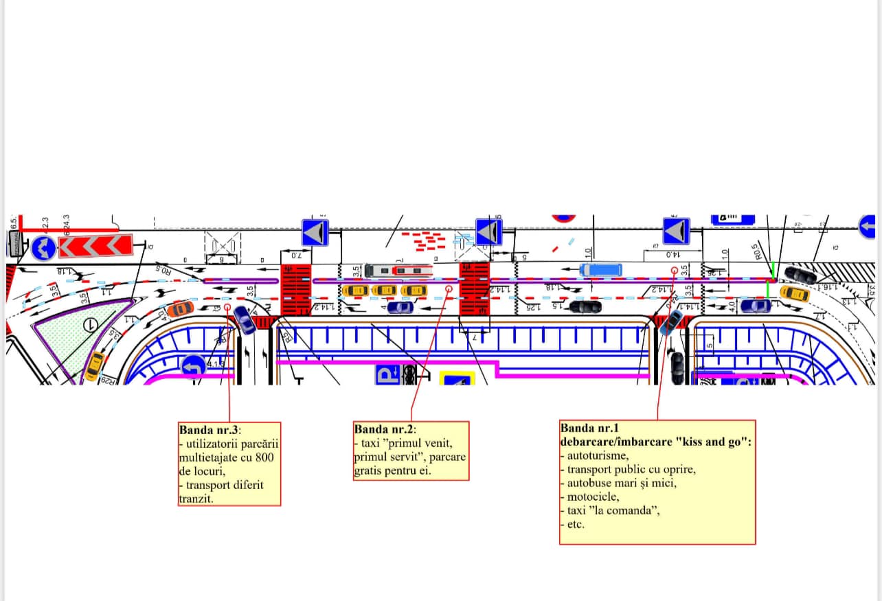 Prima bandă va fi destinată mijloacelor de transport public și autoturismelor care îmbarcă sau debarcă pasageri, cu staționare maximă de 3 minute, așa numitul „kiss & go”.