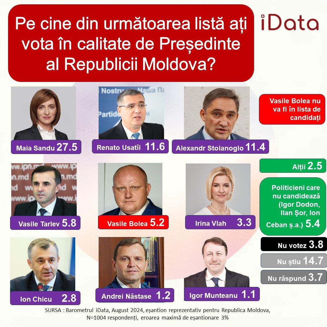 Dacă duminica viitoare ar avea loc alegeri prezidențiale, Maia Sandu ar putea obține cele mai multe voturi, potrivit rezultatelor unui sondaj de opinie prezentat de iData marți, 3 septembrie. Sondajul arată că pentru Maia Sandu ar vota 27,5 % dintre respondenți. Pe locurile II și III s-ar clasa Renato Usatîi cu 11,6% și Alexandr Stoianoglo cu 11,4%.