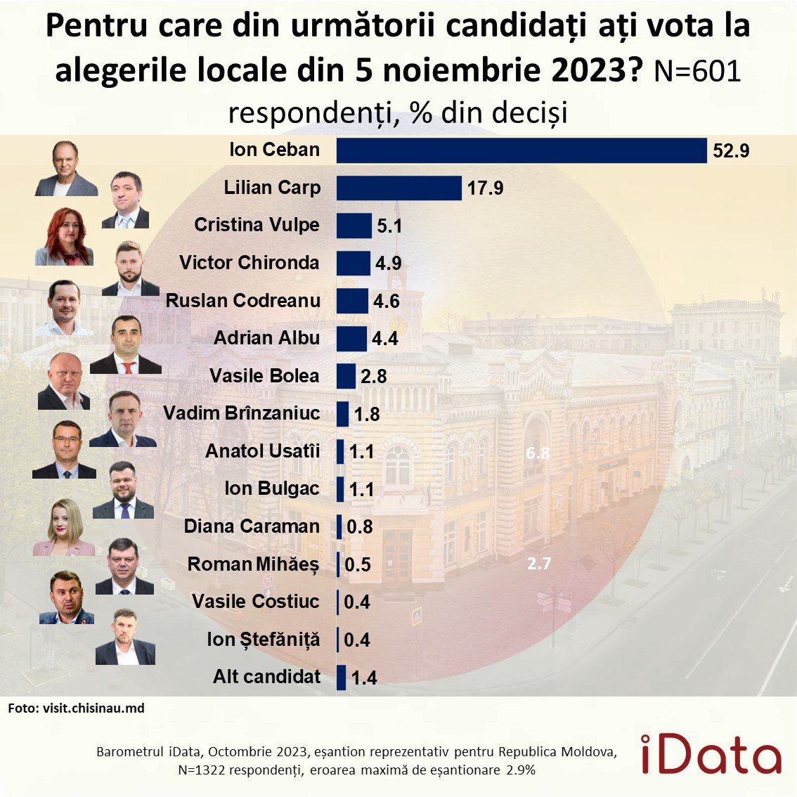 Mai mult de jumătate din totalul celor chestionați în cadrul unui sondaj iData, prezentat joi, 2 noiembrie, afirmă că ar vota la alegerile pentru funcția de primar al municipiului Chișinău în favoarea actualului edil Ion Ceban - liderul Partidului Mișcarea Alternativa Națională (MAN), în timp ce mai puțin de o pătrime spun că ar vota pentru candidatul Partidului Acțiune și Solidaritate (PAS) Lilian Carp. La coada clasamentului se află Ion Ștefăniță.