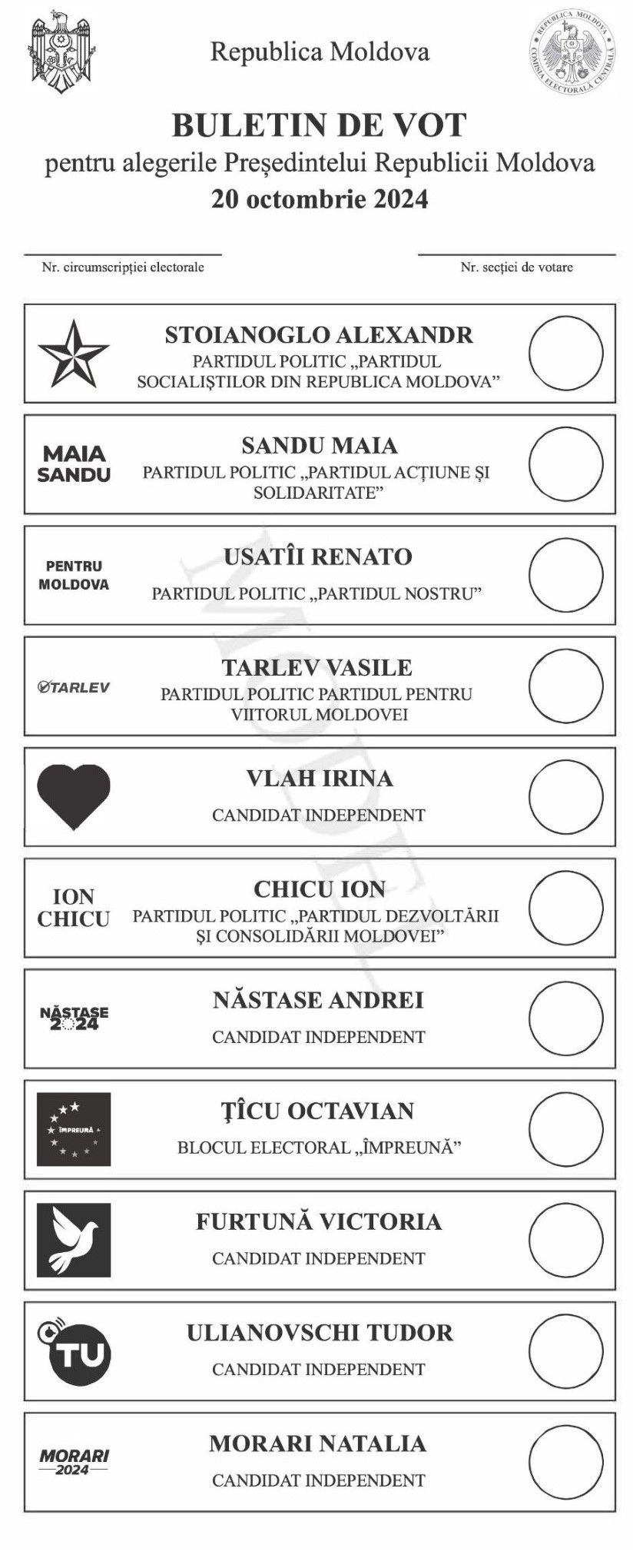 Potrivit CEC, candidații la șefia țării vor fi înscriși în buletine în următoarea ordine: